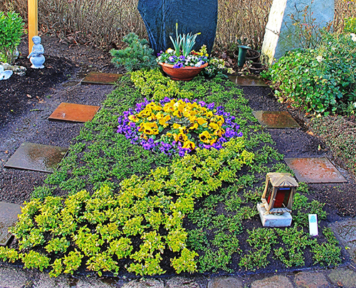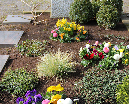 Die dauerhafte Grabgestaltung erfolgt etwa ein Jahr nach der Beisetzung – in der Regel nach dem Setzen des Grabmals und der Einfassung.